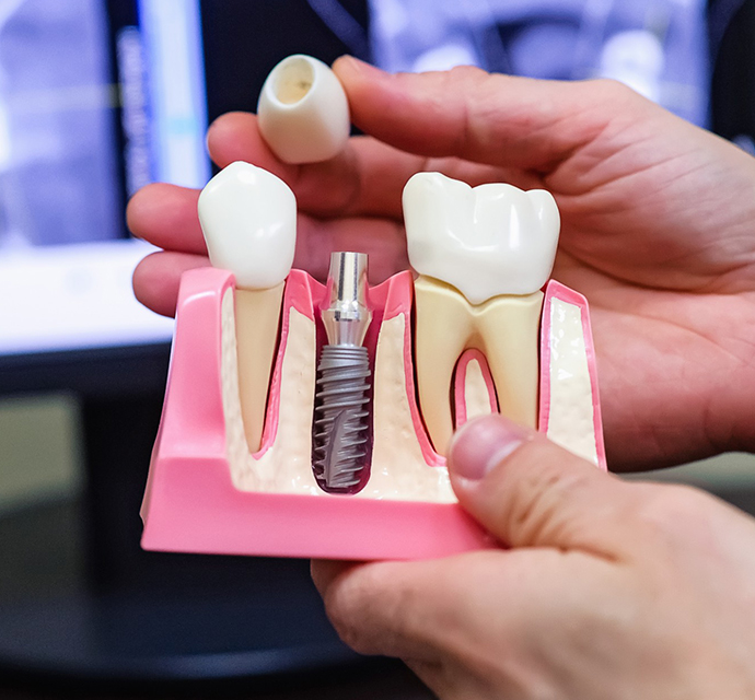 Implants are artificial tooth roots made of titanium that replace lost teeth. They are placed in the jawbone and a prosthetic tooth or bridge is attached.